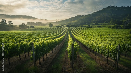 Picturesque vineyard landscape with early morning mist and sunlight patterns