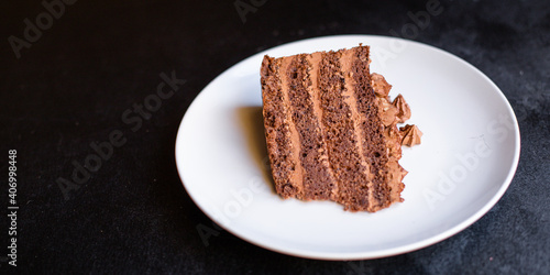 piece of chocolate cake brown cream sweet dessert on a white plate ready to eat on the table for healthy meal snack top view copy space for text food background rustic image