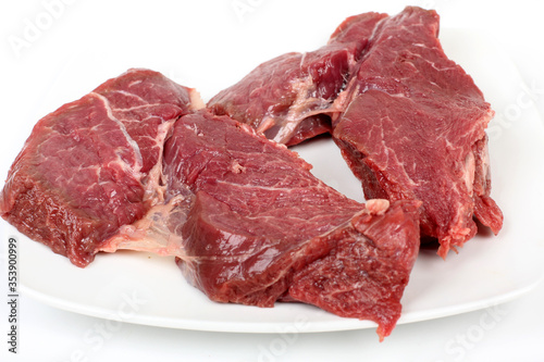 Pieces of chopped red meat on a white background