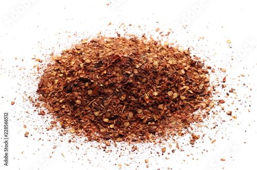 pile dry crushed red pepper, dried chili flakes and seeds isolated on white background
