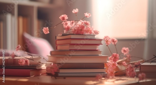 Pile of books with pink flowers on the table in the room