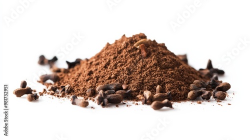 Pile of ground coffee and whole coffee beans isolated on white background. Rich aroma and taste for the perfect brew.