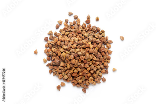 Pile of organic Black Chickpeas (Cicer arietinum) or Kala Chana isolated on a white background. Top