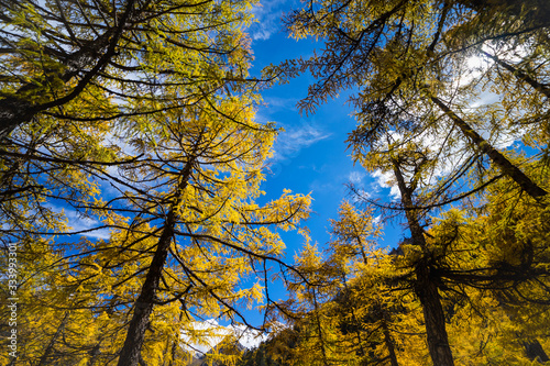 Pine Forest Nature Landscape in autumn. yellow and green pine in the mountains of Yading, China