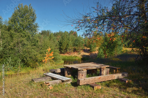 Pine forests on the shore of a taiga lake. Early autumn, the sun and ringing silence.