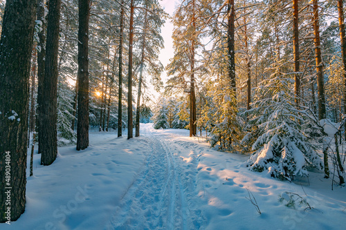 Pine trees covered with snow on frosty evening. Beautiful winter panorama