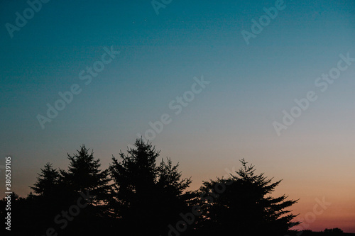 pine trees silhouetted at a colorful sunset
