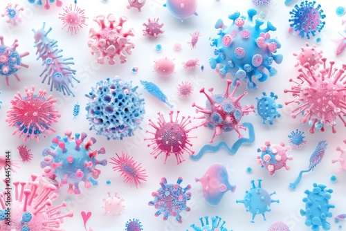 Pink and blue viruses and bacteria on white background. Science and medicine concept. 3D rendering.