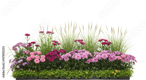 Pink and Purple Chrysanthemum Flowers with Green Grass, Isolated on Transparent PNG Background