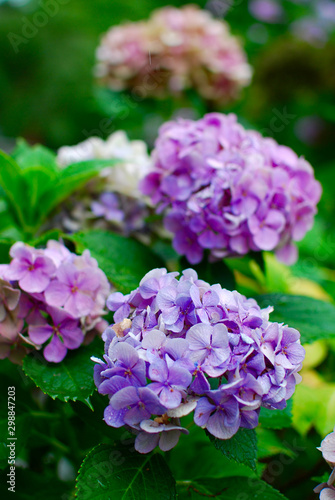 pink and purple hydrangea, or ajisai flower, blooming in rainy season in japan