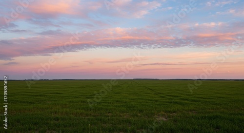 Pink and Purple Sunset Over a Green Field