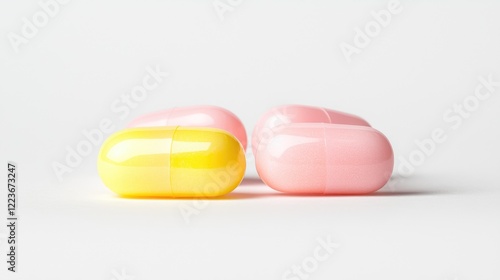 Pink and yellow capsules on white background; healthcare