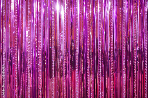 pink background. A closed up photo of pink background curtain made from foil paper and beads for party photo background.