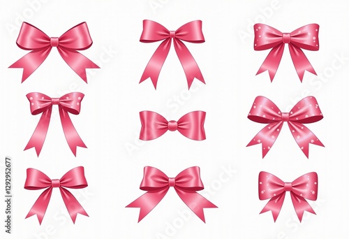 Pink Bow Clip Art Bundle: Featuring a Mix of Thin Ribbons with Flowing Tails and Thicker Ribbons with Cute White Polka Dots, Perfect for Scrapbooking and Crafts.