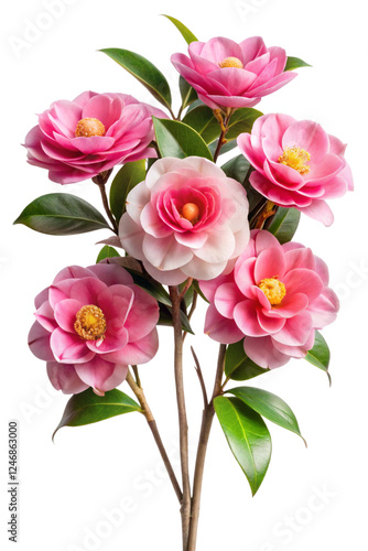 Pink Camellia Flower Bunch with Green Foliage in Full Bloom on PSD Transparent Background 1