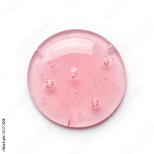 Pink cosmetic product drop with bubbles isolated on white. Beauty gel texture for packaging design or beauty content. Macro shot for skin care advertising.
