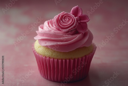 Pink cupcake with buttercream rose and flower. Perfect for Valentine's, birthday, or feminine themes.