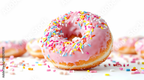 Pink Donut with Rainbow Sprinkles: A Close-Up View of a Delicious Glazed Pastry Treat, Surrounded by Colorful Confetti, Isolated on White Background