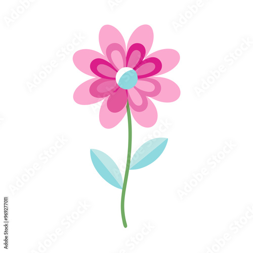 Pink floral illustration featuring layered petals, a blue center, and green leaves on a slender stem, against a white background.