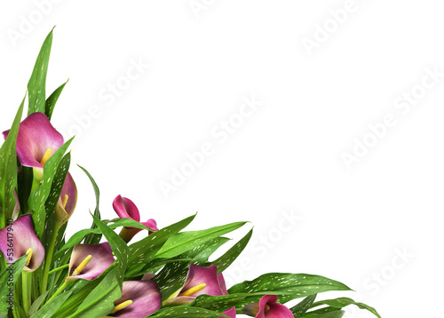 Pink flower and green leaves of Zantedeschia (calla) in a corner arrangement isolated on white