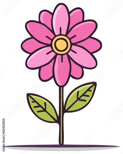 Pink Flower Cartoon Icon with Green Leaves on Stem in Hand Drawn Style for Floral Design and Spring Theme