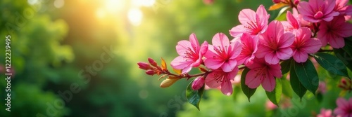 Pink flowers fill the air as they bloom on a tall tree, garden, nature