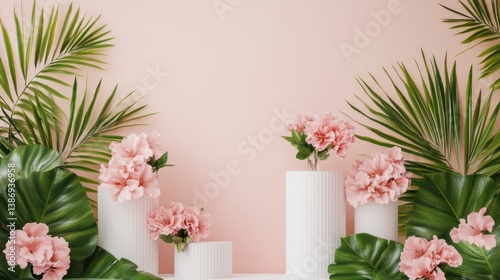 Pink flowers in white vases, tropical leaves on pale pink background. Stock photo
