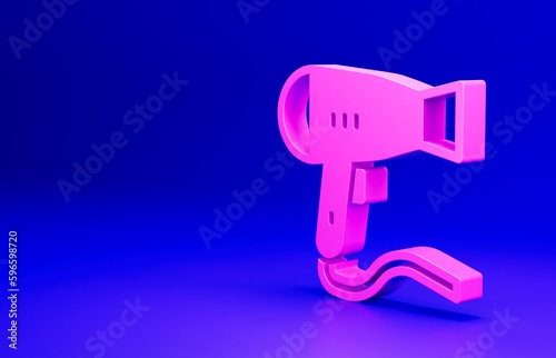 Pink Hair dryer icon isolated on blue background. Hairdryer sign. Hair drying symbol. Blowing hot air. Minimalism concept. 3D render illustration