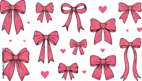 Pink hand-drawn bows and hearts collection, cute decorative ribbon set for romantic design, wedding, celebration, gift wrap elements