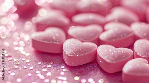 Pink heart shaped pills on sparkling pink backdrop symbolizing heart related issues medications and love