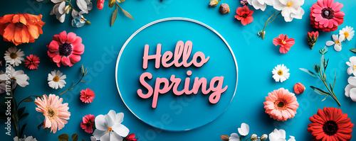 Pink hello spring lettering surrounded by colorful flowers on a vibrant blue background welcomes the new season