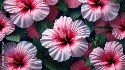 Pink hibiscus flowers closeup with lush green leaves creating a vibrant abstract background in soft horizontal arrangement.