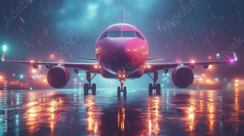 Pink jet plane on rainy tarmac at night