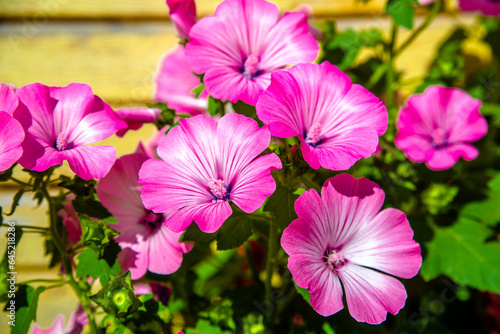 Pink lavater flowers on a green natural background