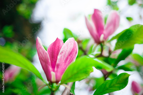 pink magnolia flowers close up. selective focus, blur, grain