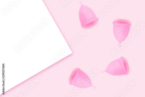 Pink menstrual cups on pink background. Flat lay, top view. copy space.