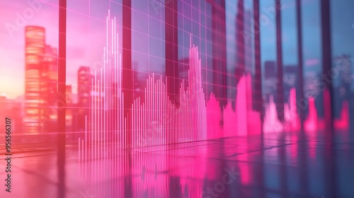 Pink neon stock market chart reflections shimmering on a glass building facade.
