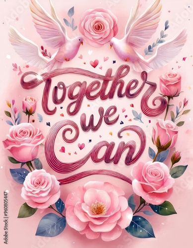 Pink October flyer. Gentle and supportive Together We Can lettering in a rounded, friendly font, with pink ribbons, flowers and pigeon. Breast Cancer Awareness Month. Graphic art illustration