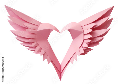 Pink paper origami heart with wings cutout on transparent background. Valentine's day-wedding. advertisement. product presentation. banner, poster, card, t shirt, sticker.