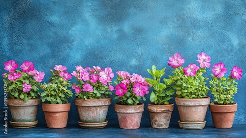 Pink Petunia Flowers in Terracotta Pots Blue Background