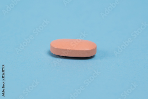 Pink pill macro on blue paper background with copy space