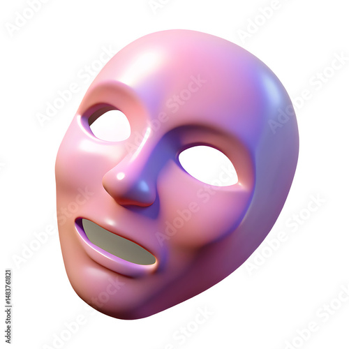 Pink plastic theatrical mask, three-quarter view. 3D rendering isolated on transparent background. Smooth, glossy plastic design element perfect for digital projects.