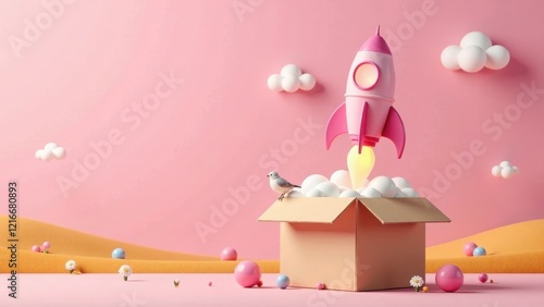 Pink Rocket Launching from a Cardboard Box Surrounded by Pastel Clouds and Tiny Flowers in a Dreamlike Setting