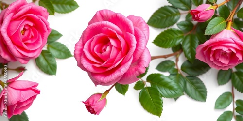 Pink rose flower frame with green leaves, white background, copy space, greenery, flat lay