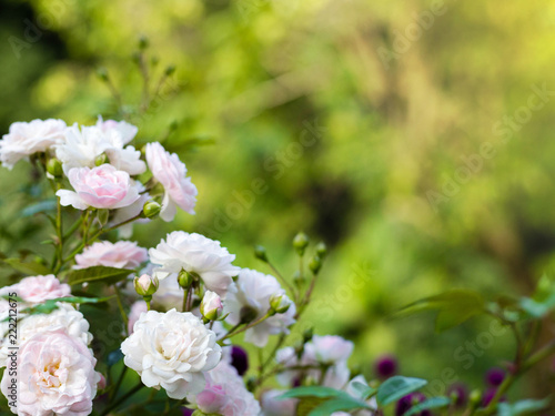 Pink rose flowers on the rose bush in the garden in summer, green soft background
