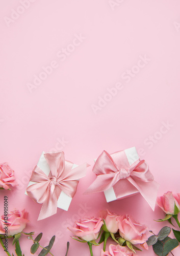 Pink roses and gift boxes on pink background for mother's day or valentine's day