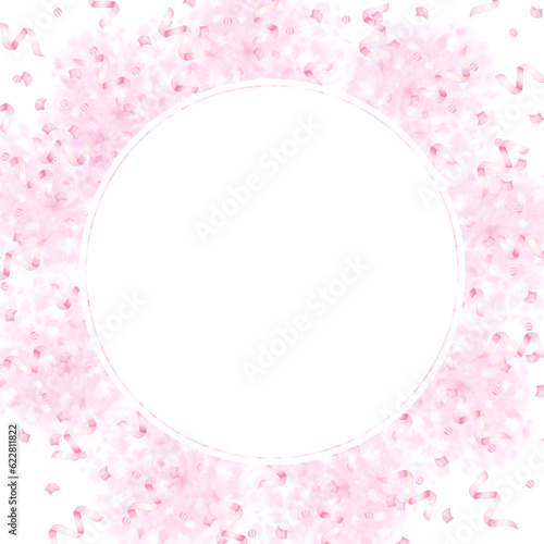 Pink round frame, template for invitation, text, postcard. Girl birthday surprise. Hand drawn watercolor illustration isolated on white background. Gender reveal party, baby shower