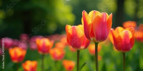 Pink-orange tulip blooms in garden with lush greenery, floral, blossoms