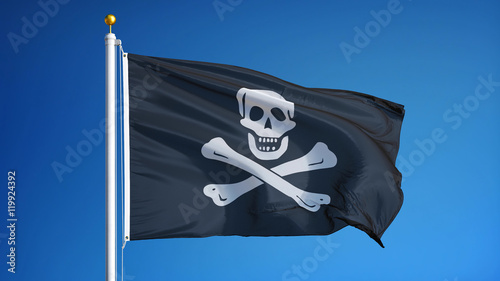 Pirate flag waving against clean blue sky, close up, isolated with clipping path mask alpha channel transparency