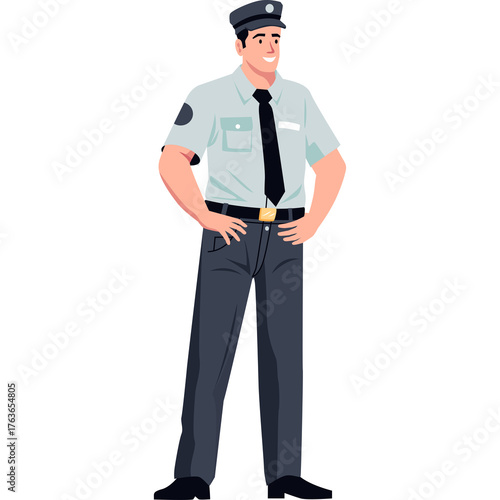 Pixel Art Illustration of a Smiling Male Police Officer in Uniform with Dark Cap and Tie Standing Confidently with Hands on Hips Against a Transparent Background